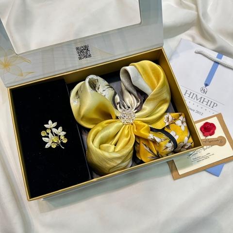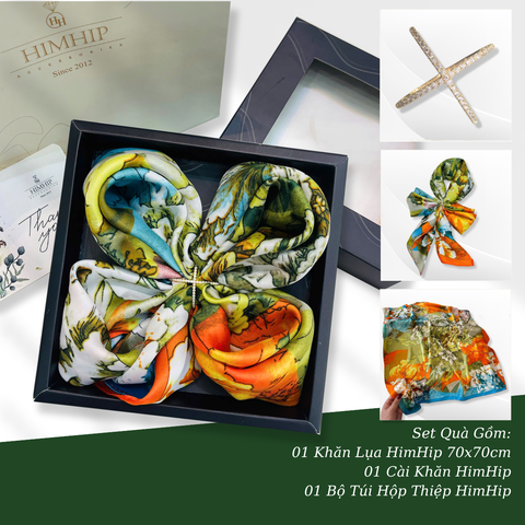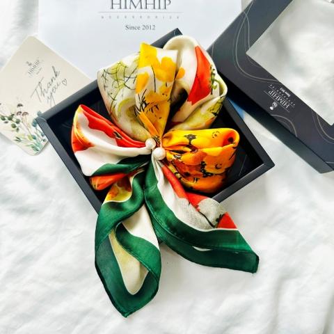 Trong BST "Chạm Thu", Himhip giới thiệu 2 dòng chất liệu là khăn lụa tơ tằm và khăn lụa nhân tạo. 1. Khăn lụa tơ tằm: